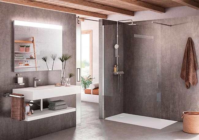 If you have the privilege of having a spacious bathroom you can forget any restrictions and leave behind any feeling of constriction by installing big shower trays in different materials. With a cut-to-size option and in different colors, you will find the Terran, Helios and Aquos resin shower trays, the Cratos antislip vitreous china models or the pleasant texture of the Modo shower trays, manufactured in Surfex®, Roca’s Solid Surface.