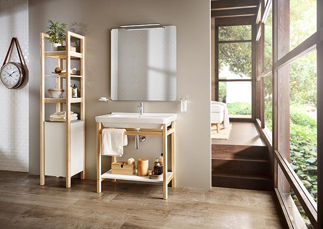 Evocative and warm, natural wood furniture units add personality to any space. In open and unobstructed interiors, opt for the Savana countertop in City Oak to make your basin stand out as the theme of your interior design. And if your home is defined by minimalism, install a Natura base unit with basin, an open structure with a Nordic style that combines white color and natural wood.